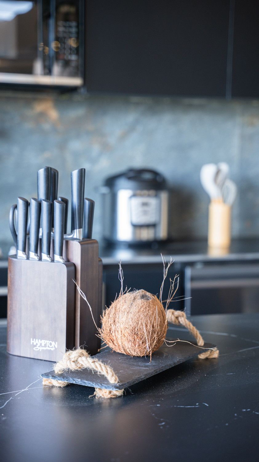 Serving those tasty delicacies directly on the kitchen bar and dining with a tranquil and leafy outdoor view.