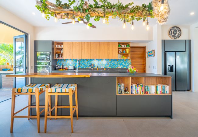 At the heart of the home, large sliding doors open fully to a covered terrace that becomes the main living space. A lounge area, outdoor dining table, BBQ, and pool are all oriented toward the ocean, creating a natural flow between gathering, relaxing, and time spent outdoors. The transition from terrace to lawn to beach is seamless, with open views framed by mature palms and tropical gardens.